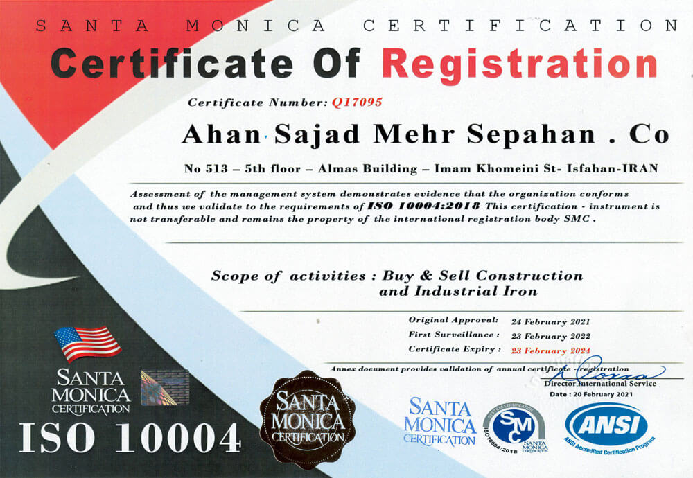 ISO 10004 як сертификати дигаре мебошад, ки Маркази Оҳан ба дарёфти он муваффақ шудааст. Маркази Оҳан ин сертификатро дар партави муштаримадорӣ ва ҷалби қаноатмандии онҳо, бо рафъи ниёзҳои муштариёни худ дар муддати кӯтоҳ ва бо сифати баланд, касб карда аст. Ин созмон ҳамеша ризояти муштариёнашро дар авлавияти кори худ қарор дода, доим дар талош аст то бо беҳбуд бахшидан ба хизматрасониҳои худ хариду фурӯши таҷҳизоти оҳаниро барои муштариёни азиз осон кунад.